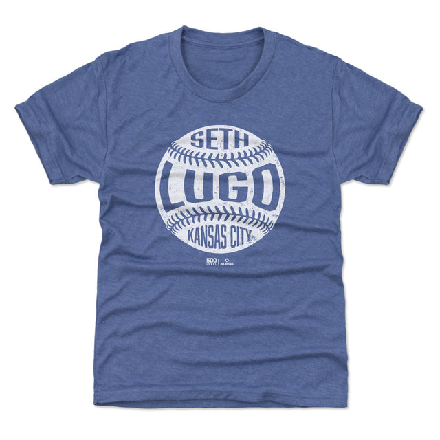 Seth Lugo Kansas City Vintage Baseball WHT - Kids T-Shirt / Tri Royal / YXS is backordered and will ship as soon as it is back in stock.
