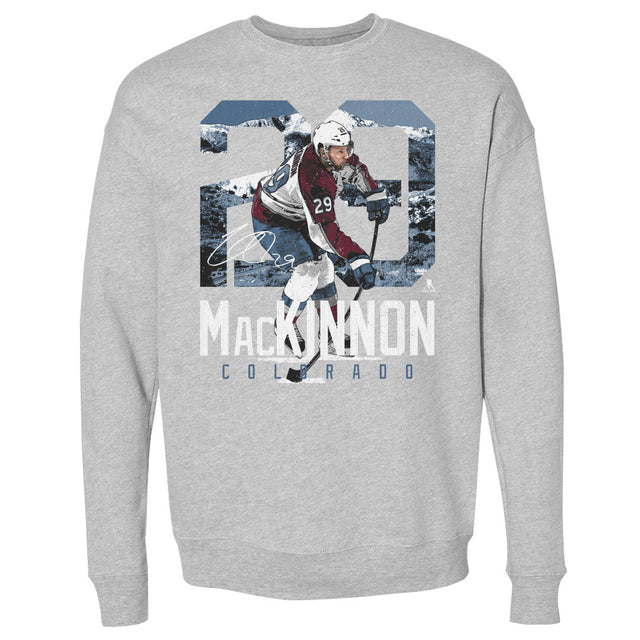 Nathan MacKinnon Colorado Landmark WHT - Men's Crewneck Sweatshirt / Heather Gray / S is backordered and will ship as soon as it is back in stock.